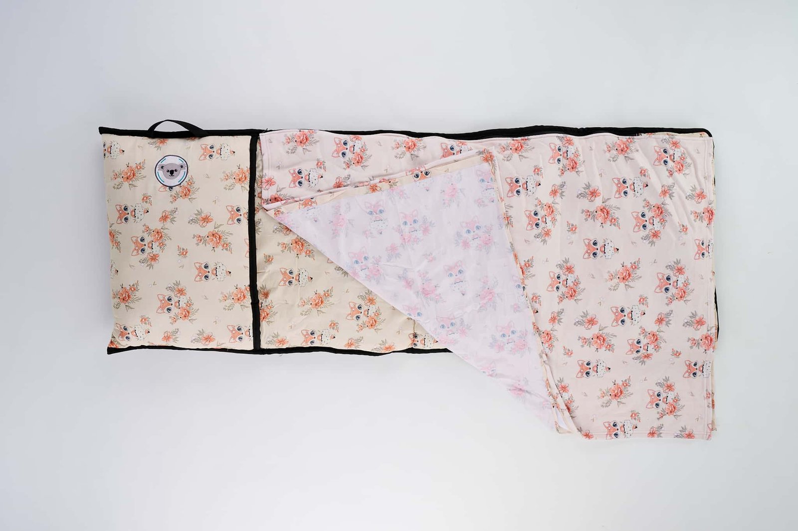Our Fairy Fox Sleep Mat is part of our luxury line as it comes with sublimated sheet and polar fleece blanket, as-well as an extra thick layer of padding making it even more comfortable. A beautiful and delicate mix of peach and orange with the cutest little fox surrounded with gorgeous flowers make this one of our prettiest designs.